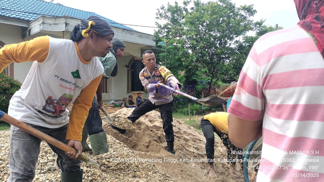 Aksi Bhabinkamtibmas Kerumutan Ikut Gotong Royong Cor Jalan di Desa Pematang Tinggi