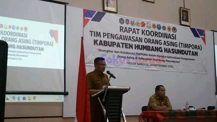 HUMBAHAS – Bupati Humbang Hasundutan, Dr. Oloan Paniaran Nababan, SH, MH diwakili Asisten Perekonomian dan Pembangunan Martogi Purba, membuka secara resmi Rapat Koordinasi (Rakor) Tim Pengawasan Orang Asing (TIM PORA) Kabupaten Humbang Hasundutan di Aula Hotel Akasi Doloksanggul, Selasa 23 September 2025.