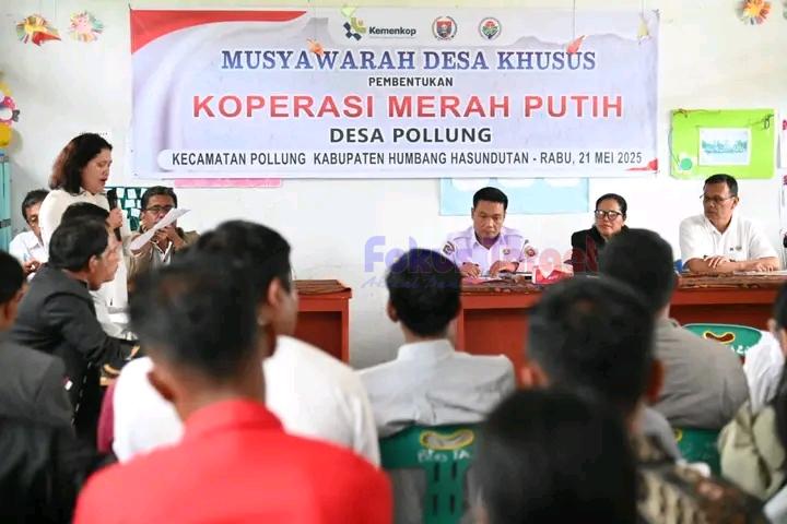 HUMBAHAS – Bupati Humbahas Dr Oloan P Nababan SH MH hadiri pembentukan KDMP (Koperasi Desa Merah Putih) di dua (2) tempat di Kecamatan Pollung yaitu Desa Pollung dan Desa Aek Nauli 1, Rabu 21 Mei 2025. Kehadiran Bupati Humbahas dan dinas terkait di desa itu untuk memberikan dukungan penuh sebagai upaya pembentukan KDMP.