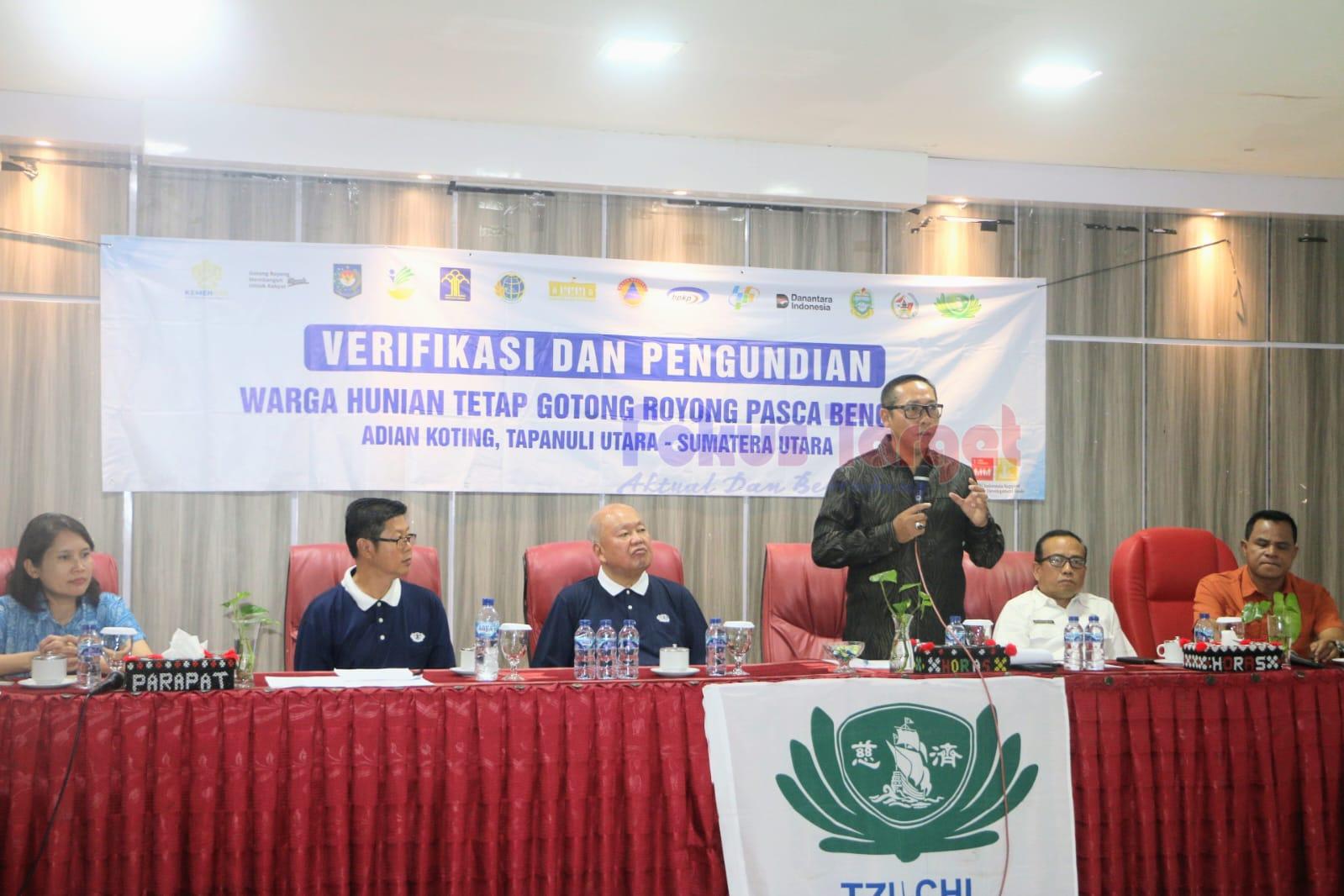 Dalam sambutannya, Bupati Tapanuli Utara menyampaikan bahwa kegiatan ini merupakan proses verifikasi sekaligus pengundian untuk 70 unit rumah terdampak bencana hidrometeorologi karena seluruh warga memiliki hak yang sama. Dengan sistem ini, proses penentuan rumah berlangsung adil, terbuka, dan seluruh unit rumah memiliki kualitas yang sama, ditargetkan mulai ditempati pada pertengahan Mei 2026.