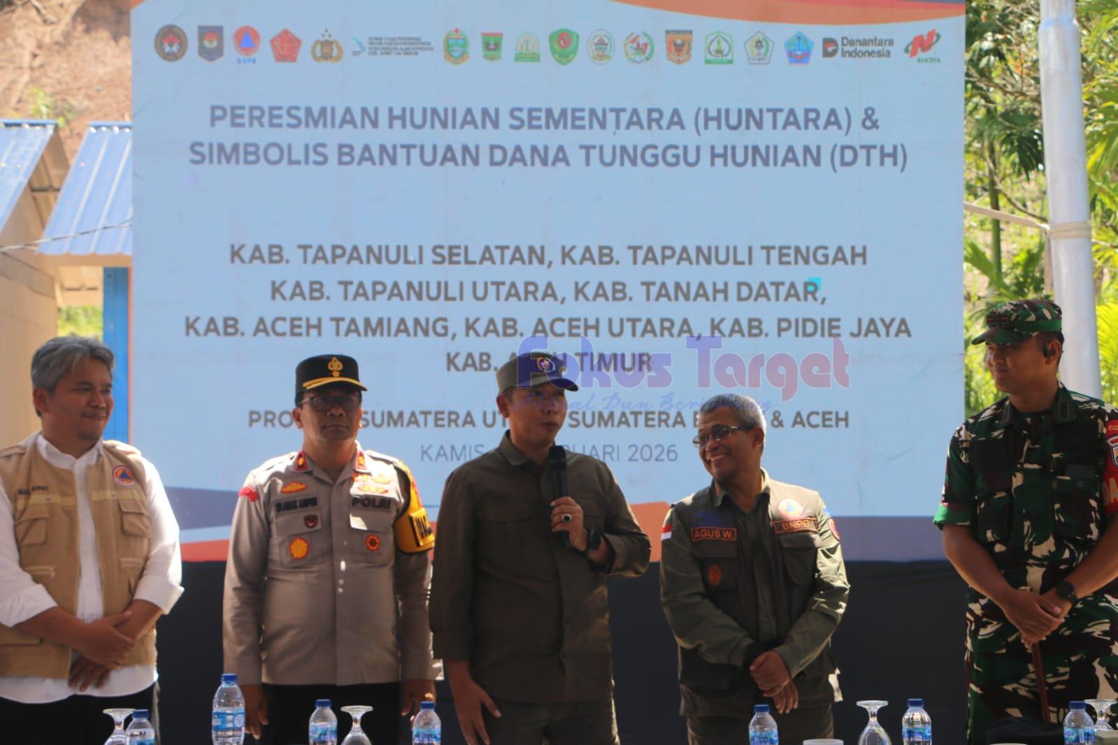TAPUT – Menteri Dalam Negeri Republik Indonesia sekaligus Ketua Satuan Tugas (Satgas) Percepatan Rehabilitasi dan Rekonstruksi Pascabencana Sumatera, Tito Karnavian, bersama Kepala Badan Nasional Penanggulangan Bencana (BNPB) Letjen TNI Suharyanto dan Gubernur Sumatera Utara Bobby Nasution meresmikan Hunian Sementara (Huntara) serta menyerahkan bantuan Dana Tunggu Hunian (DTH) secara serentak di tiga provinsi, yakni Sumatera Utara, Sumatera Barat, dan Aceh.