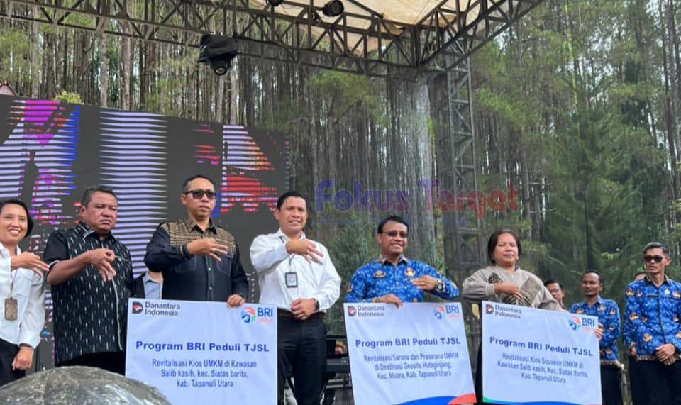 Pemberian CSR BRI sarana pertanian yang diwakili oleh Bonar Gultom sebagai SBM BO Tarutung, Sesilya Siburian sebagai SPO, bersama anggota DPR RI Lamhot Sinaga, berlangsung di Pelataran Salib Kasih Tarutung, Kabupaten Tapanuli Utara, pada Senin, 10 November 2025.