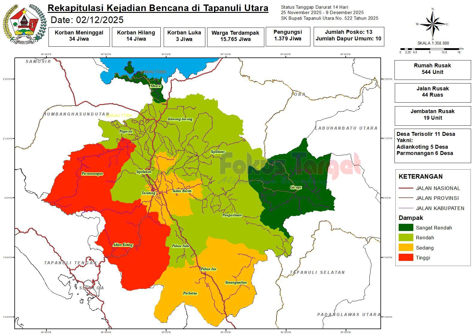 TAPUT – Penanganan bencana di Kabupaten Tapanuli Utara terus dikebut setelah banjir bandang dan longsor melanda sejumlah kecamatan sejak 25 November 2025. Berdasarkan data terbaru yang dirilis Pemerintah Kabupaten Tapanuli Utara pada Selasa, 2 Desember 2025 pukul 19.00 WIB, tercatat sebanyak 15.765 warga terdampak. Bencana ini mengakibatkan 34 warga meninggal dunia (22 warga Tapanuli Utara dan 14 warga dari luar Taput), 14 orang masih hilang, serta 3 warga mengalami luka-luka. Di samping itu, kerusakan infrastruktur cukup masif, meliputi 544 unit rumah rusak, 19 jembatan putus, serta 44 ruas jalan yang tertutup material longsor maupun terputus akibat banjir.